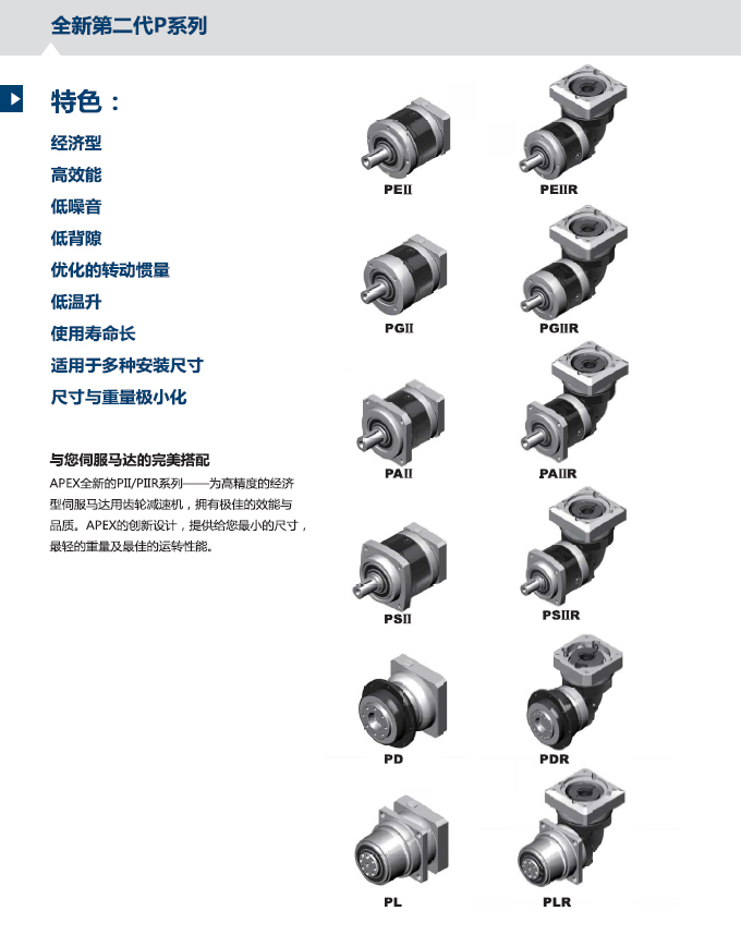 經(jīng)濟(jì)型 高效能 低噪音 低背隙 優(yōu)化的轉(zhuǎn)動慣量 低溫升 適用于多種安裝尺寸 尺寸重量極小化