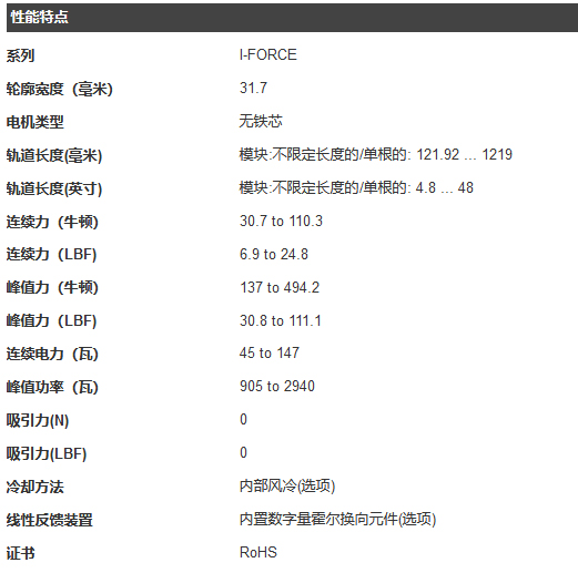 派克 I-Force 210 無(wú)鐵芯直線電機(jī) 相對(duì)于緊湊的體積提供高推力和急加速的能力. 持續(xù)推力范圍 30.7 N (6.9 lbf) to 110 N (24.8 lbf) ,峰值推力范圍 137 N (30.8 lbf) up to 494 N (111 lbf), 在I-Force系列提供極佳的性能和尺寸組合。專(zhuān)利的工字型骨架和重疊的繞組設(shè)計(jì)提高了電機(jī)的功率密度,改善了散熱,以及附加的結(jié)構(gòu)剛度。此外,無(wú)鐵心(或空氣芯)直線電機(jī)繞組與磁軌之間沒(méi)有吸引力。這樣便于安裝和運(yùn)動(dòng)過(guò)程中的零齒槽效應(yīng)。I-Force系列配備了超高柔性電纜。此外,派克提供模塊化磁軌實(shí)現(xiàn)無(wú)長(zhǎng)度限制的行程。令人難以置信的是平滑運(yùn)行,高精度,高推力密度使I-Force系列直線電機(jī)成為要求苛刻的定位要求的理想解決方案。