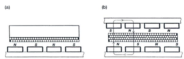 交叉覆蓋方式,三個線圈組合占一個極 距,空間利用率高,動子較短。線圈無 效的兩邊可排列在磁場外,可以增加散 熱效果